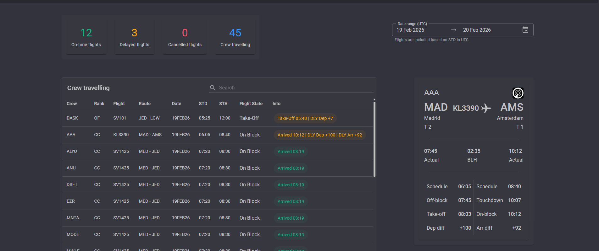 LOKO is purpose-built for duty managers and crew controllers who need minute-by-minute situational awareness of crew travelling on other airlines